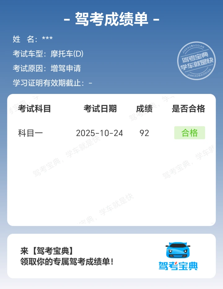 勤奋与汗水护航; 幸运与机遇并存; D证科一顺利过!