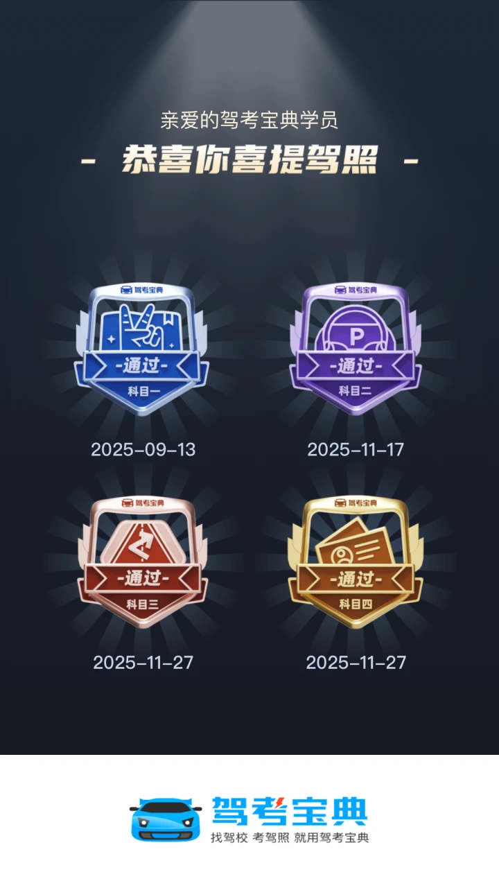 浅浅记录一下驾考成绩。科一到科四